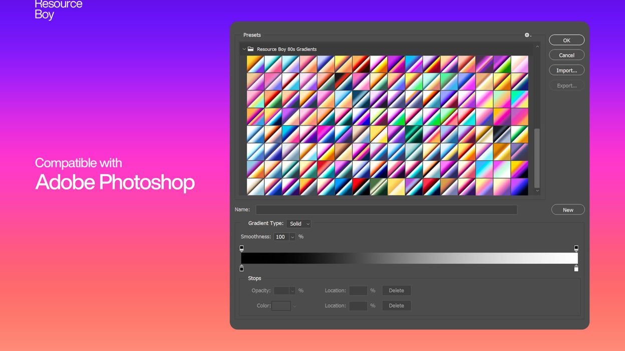 Sometimes you just need something that looks good instantly. 80s Photoshop Gradients is built for that. It’s made for Adobe Photoshop, and the previews show what you can expect.